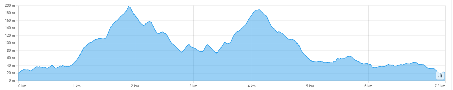Provided you follow the provided gpx file diligently, the total distance will be slightly more than seven kilometres in total. There are possibilities to take a shortcut; consult your navigation app.